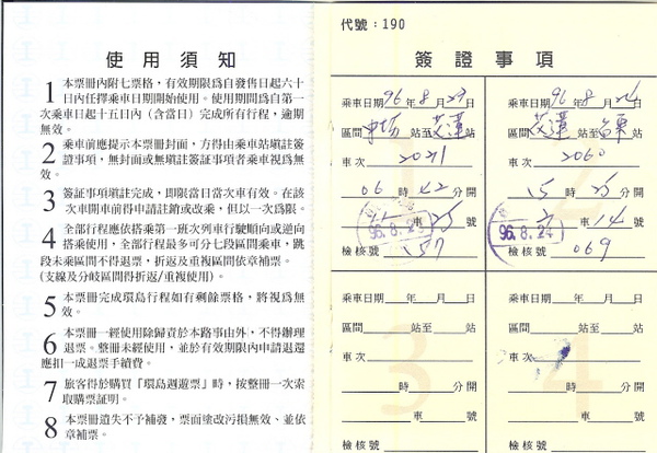 不過進站、出站的查票人員,對於「環島週遊票」的冷漠態度,還真讓我嚇了一跳,印象中只有台東站出口的查票人員,概略看了一下我的車票本,其他各站的進站、出站查票人員,看到我把車票本拿在手上晃啊晃的,根本理都不想理,就直接示意要我過閘門離開。
