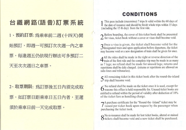 「環島週遊票」使用的規則很簡單,自發售之日起六十日內有效,第一段票開始使用後十五日內須將各段車票使用完畢,每本車票內有七段票可以使用。第一段票的方向一但確定,之後就得按著順時針或逆時針方向完成環島行程,除了支線鐵路得往返以外,各線均不得走回頭路,這很合理,如果回頭了,那幹嘛環島?