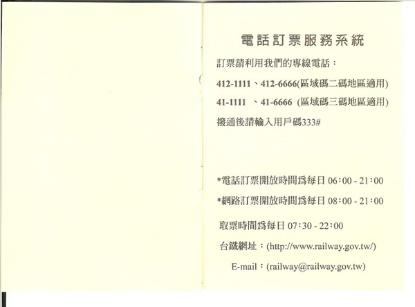 任何一個縣市的觀光護照,肯定都比「環島週遊票」還要精美,這樣的封面令人倒胃!再看看封底,說著要「自我提昇,邁入21世紀」,可是右下角卻用著超級懷舊的三張照片,第一張是古董得不能再古的橫放式桌上型電腦,中間這位揮著手的司機大哥,正在駕駛舊型柴油機車頭,而最下面那張照片,車內的服務小姐,竟然還身著八百年前的大紅色制服。台鐵啊!台鐵!加加油吧!